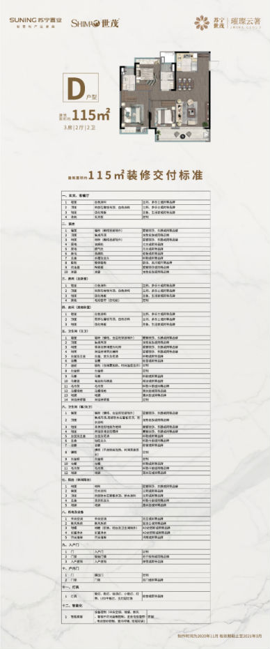 事实上,苏宁世茂璀璨云著精装品牌也很给力。一个智能化科技感的家+全进口的三大件,并采用一线精装品牌。部分装修标准包括: