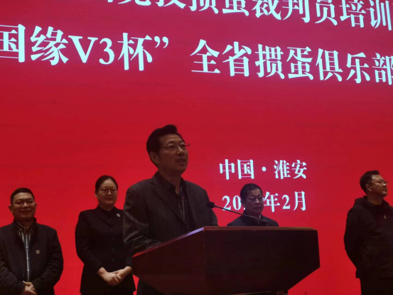 掼蛋运动与文化发源地、本次精英赛赛事所在地和协办方的领导、中共淮安市委常委、宣传部部长、秘书长李森先生致词,感谢国家体育总局棋牌运动管理中心和省体育局对淮安体育事业的关心支持,对来自全国各地的掼蛋裁判员及全省各级掼蛋俱乐部的参赛运动员表示热烈的欢迎。